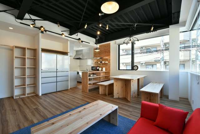 古い団地を改装したハウスは決して広くはないけれど、ゆったりと寛げるようにデザイン。リビングダイニングは、すっきりとしたステンレスキッチンと木の肌ざわりが心地良いリビングダイニング兼用テーブルを中心にレイアウト。椅子に座ればなぜか落ち着く、寛ぎ空間です。