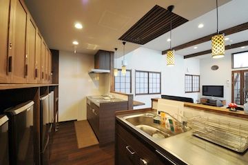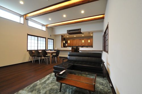 西陣は京都を代表する織物産業の街です。織物問屋を兼ねた住宅を全面改装しシェアハウスとしました。元々作業場だった広い空間は、高い天井を生かして30畳のLDKとなり、開放的な住まいとなりました。明かり取りの窓から差し込む光も、毎日を心地良い気分にしてくれます。