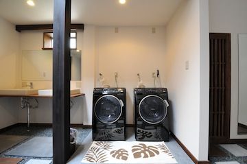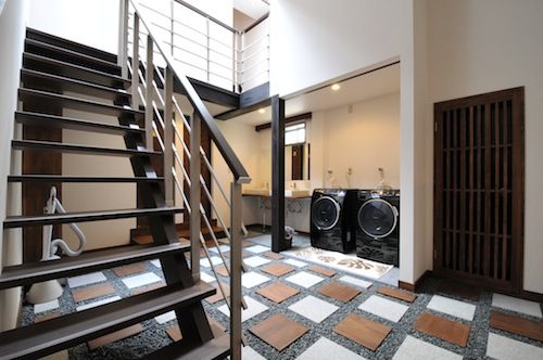玄関ホールは砂利の上に踏み石が配置され、旅館のような雰囲気です。大きな和紙のペンダントライトが空間を引き締めています。何気ない生活動線が、より上質なものとなれば嬉しく思います。