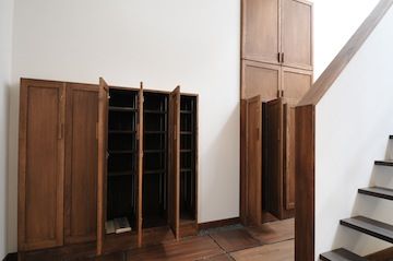 シューズクローク、フードストックは扉付きなので見た目もスッキリ。使う場所の近くに各自の収納スペースを設けているので、部屋から持ってきたり、持ち帰ったりする必要はありません。