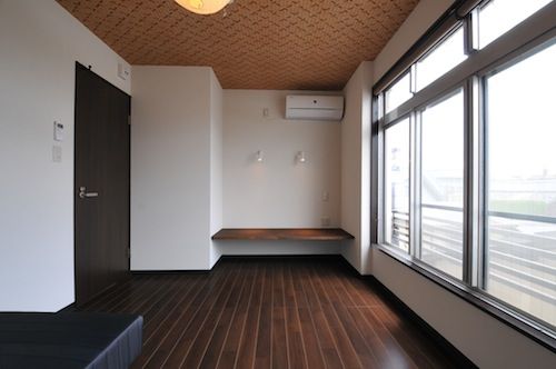 303号室の床はブラウンのフローリング。天井は網代風の壁紙です。作り付けの棚は文机としても使えます。