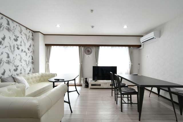 ソファやテーブル・チェアなどのインテリアが白色で統一されていることもあり、より壁紙のブルーストライプの存在感が強調されています。