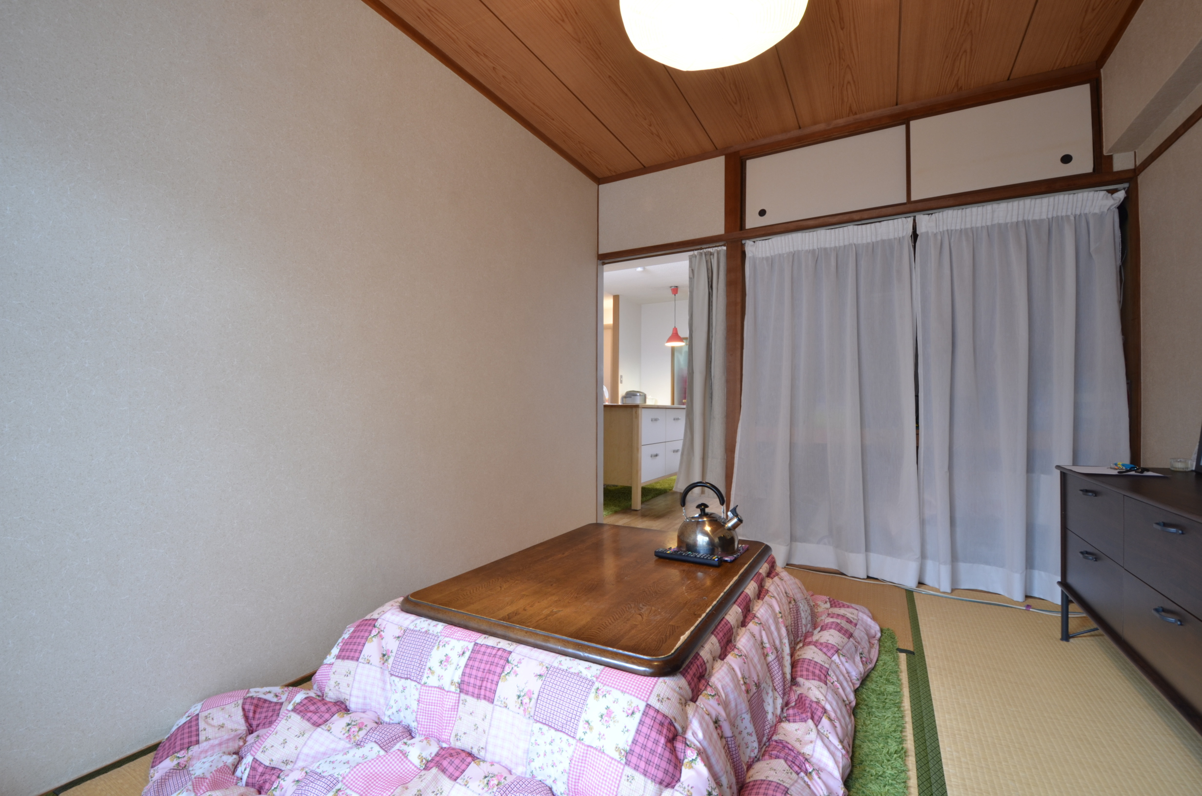【自然素材の古民家シェアハウス】古民家をリノベーションして生まれた温もりあるシェアハウスです(2016年8月)。歴史を感じさせる柱や梁を活かしながら、広々とした共有リビングやキッチン、モダンな琉球畳の畳スペースを備え、居心地のよい空間となっています。内装には漆喰の壁や無垢の杉板フローリングなど、自然素材をふんだんに使用し、落ち着いた雰囲気があります。一般的な賃貸住宅ではなかなか味わえない、古民家ならではの暮らしを楽しむことができます。