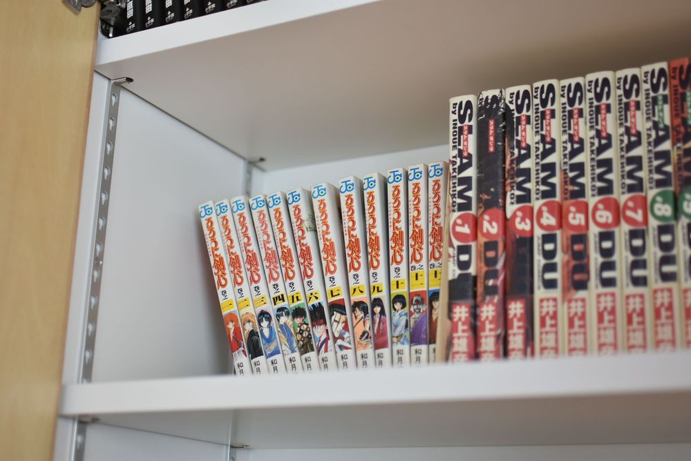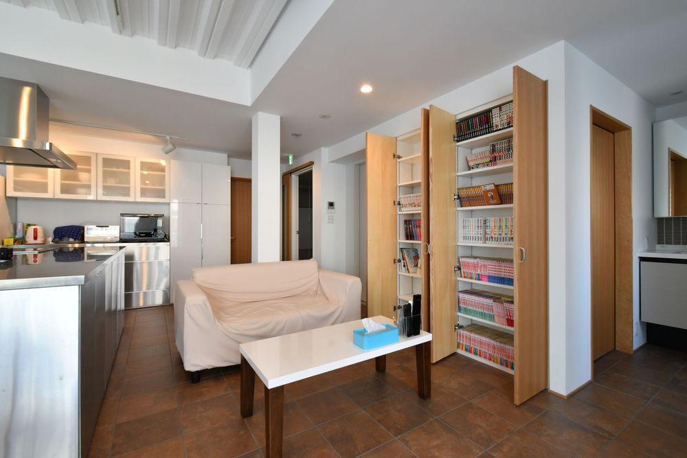 ソファスペース側には、TVと開閉式の収納棚を設置。オーナーさんが趣味で集めた漫画が、たっぷりと収納されています。漫画のラインナップも豊富で、入居者は自由に漫画を読むことが可能。読み終えた漫画について入居者同士で話をしたり、DVDを見ながらくつろぐことができます。