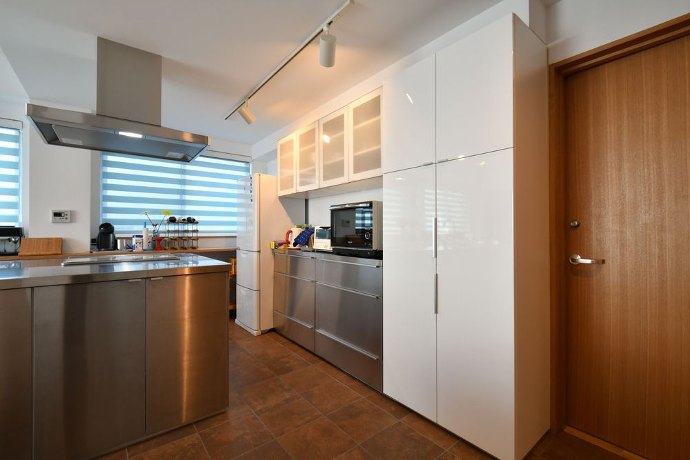 ステンレス製のアイランドキッチン。大きな作業台やIHクッキングヒーター付きで、機能も充実させました。作業がしやすいように、キッチンの通路は幅広。シンクと作業台が対面になっているため、入居者同士で料理を作りながら会話を楽しむことができます。個人の収納スペースがたっぷりと用意されているため、料理好きの人でも安心です。