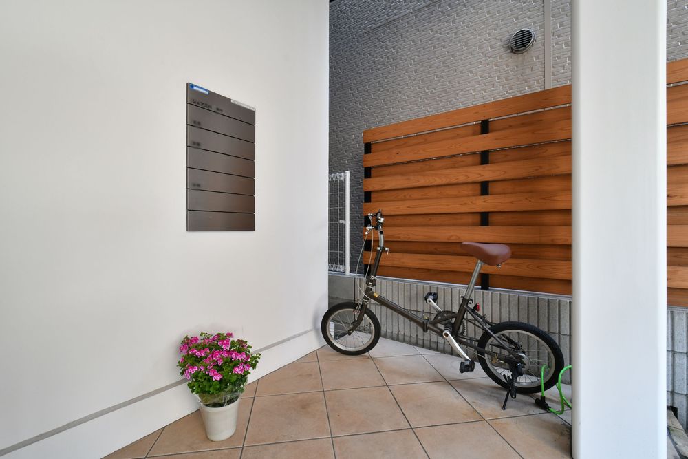 専有部ごとに分かれた、郵便受け。届いた郵便物は靴箱側から取り出す仕様のため、書類の取り出しがスムーズです。駐輪場には、共用の自転車を2台用意。天気の良い日は、気軽に周辺を散策することができます。駐輪場側には自動販売機を設置しているため、のどが渇いた時は気軽に利用することができます。