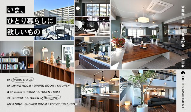 LIGHTS APARTMENTは大阪大学グローバルビレッジ内に位置するシェアハウスです。敷地内には大阪大学の学生・職員寮、高級一般賃貸、サービス付シニアレジデンス、商業施設、また人々が気軽に交流できる九十九テラスやコミュニティガーデンがあり、多世代・多文化の人々が集い、学び、交流することができます。(グローバルビレッジは単なる居住ハードではなく、異文化交流・地域交流等を含めた、グローバル人材育成拠点にもなっています。)LIGHTS APARTMENTでは、通常のシェアハウスよりも多彩なシェアスペースをご用意しています。物件のコンセプトは「ドレスルーム」。各階ごとに壁紙のカラーを大きく変え、特色を持たせることで様々なライフスタイルが楽しめるようにしております。6階には広いワーキングラウンジを完備。在宅勤務にも対応可能です。